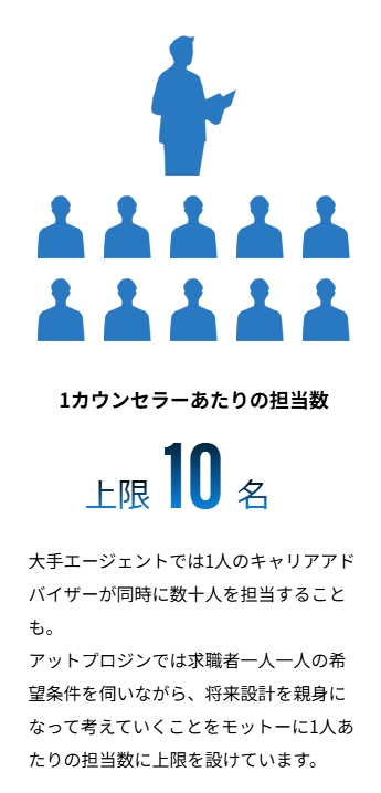 一般的な大手転職エージェントでは、アドバイザー1人が50?100人の求職者を担当するケースもありますが、@PRO人では最大10名までに制限。